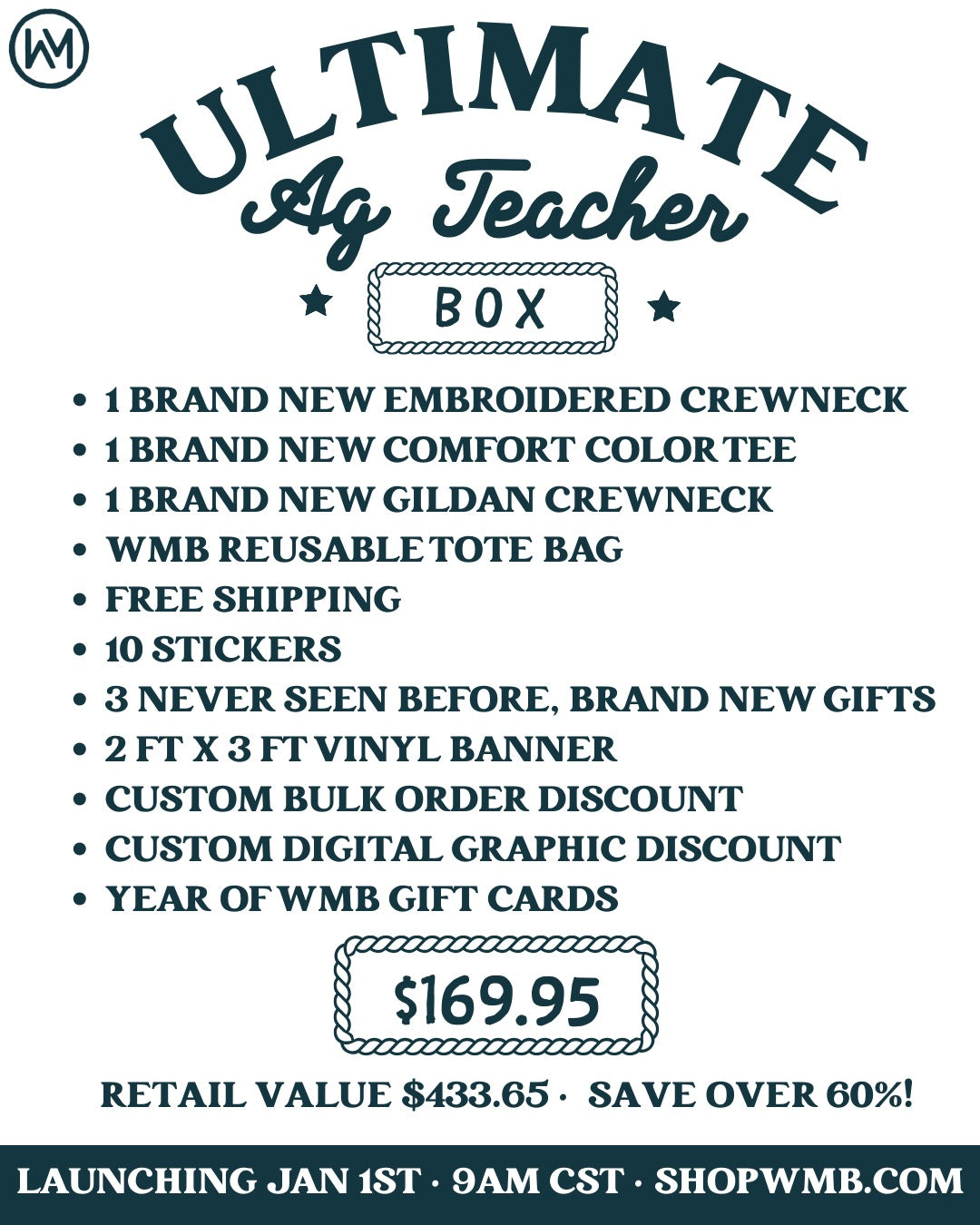 Packed with over $430 in value and curated just for ag teachers, this box is the perfect mix of apparel, classroom goodies, exclusive WMB items, and teacher must-haves. Whether you’re gifting it for Christmas, Teacher Appreciation, birthdays, or “just because,” this is the gift they’ll be talking about all year long.