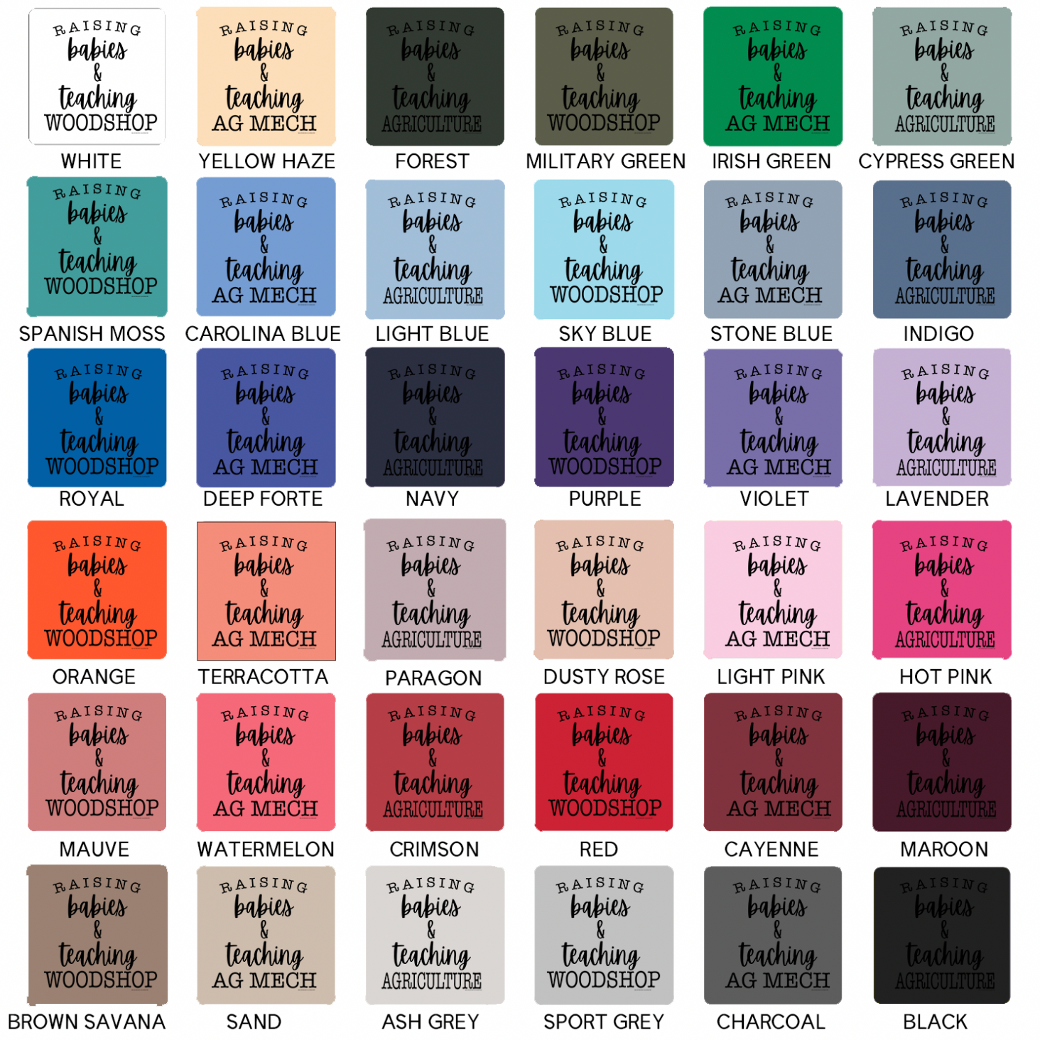 Black ink will not show on black garments; ink colors appear exactly as shown and cannot be customized, and colors may vary slightly from screen to screen as these are mockups of the final product.