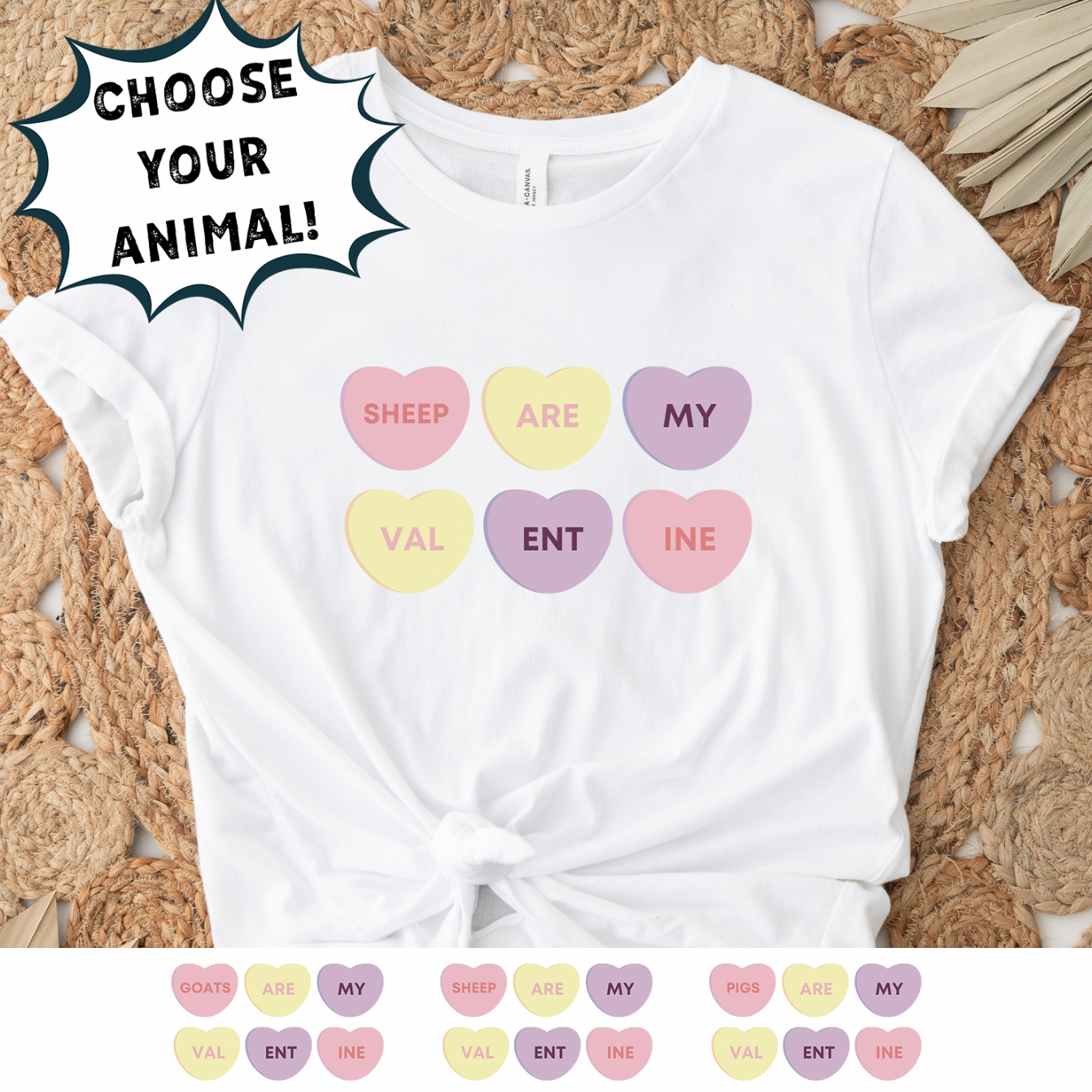 CANDY HEARTS - CHOOSE YOUR ANIMAL - Bella Canvas T-Shirt